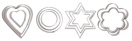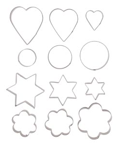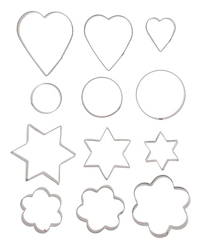 Rôzne tvary: kruh, srdce, kvet, hviezda, každý v 3 rôznych veľkostiach, Rozmery: cca 30-70 mm, výška cca 15 mm, vysoko kvalitný kov vhodný pre styk s potravinami, sada 12 ks