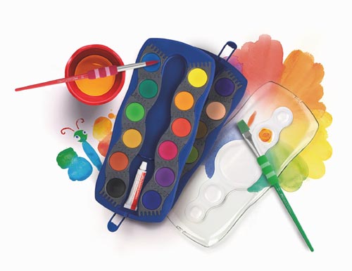 Jasné farby, vysoká krycia schopnosť, vzájomne miešateľné. S priehradkou na štetec, pole na meno a miešacou paletou vo veku. 24 farieb a 1 tuba nepriehľadnej bielej, škatuľka s nepriehľadnou farbou v modrej farbe. Škatuľky s farbami je možné jednotlivo spájať, aby sa podporilo učenie sa teórie farieb.