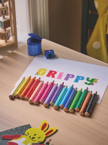 Farebné ceruzky 3 in 1 sú farebné ceruzky, voskové pastelky a akvarelové ceruzky v jednom. Balenie obsahuje 10 vo vode rozpustných farebných ceruziek v žiarivých farbách. XXL jumbo tuha je mäkké a odolná. Patentovaná Grip Zone poskytuje bezpečný a protišmykový úchop, sú špeciálne vyvynuté pre malé detské ručičky. Ergonomický trojuholníkový tvar podporuje prvý úchop ceruzky a zabranuje jej kotúľaniu zo stola. Atrament je zmývateľný z väčšiny hladkých povrchov (napr. kov, sklo, zrkadlo atď.). Farebné ceruzky vyrobené z dreva s certifikátom FSC. Súčasťou balenia je strúhadlo Grippy s bezpečnostnou skrutkou a ochranou proti porezaniu.