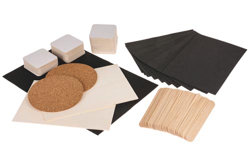 Základné materiály na laserové rezanie, rôzne (náhodný výber). Obsah: 2 dosky z topoľovej preglejky, každá 300 x 210 x 3 mm; 2 korkové kotúče, 180 x 5 mm; 1 čierny filcový list, 450 x 300 mm; 10 penových gumových listov, 290 x 200 x 2 mm; 50 drevených špachtlí, 200 x 24 mm; 100 podložiek pod pohár, 93 x 93 mm. 1 sada
