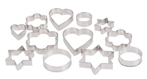 Rôzne tvary: kruh, srdce, kvet, hviezda, každý v 3 rôznych veľkostiach, Rozmery: cca 30-70 mm, výška cca 15 mm, vysoko kvalitný kov vhodný pre styk s potravinami, sada 12 ks