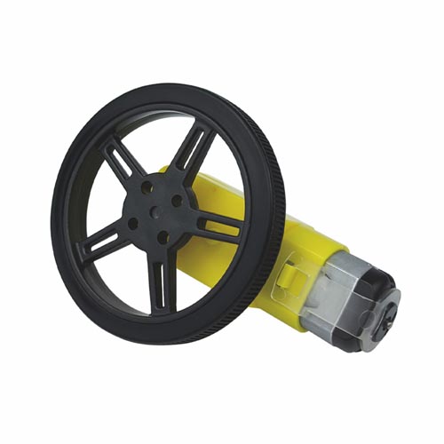 Rovný dizajn, dva výstupy. Vrátane 100 mm pripojovacieho kábla, otvorené konce. 2-dielna sada. Technické špecifikácie: Prevádzkové napätie: 3 - 6 V DC. Max. odber prúdu: 160 mA Max. rýchlosť pri 6 V: 200 ot./min. Výstupný hriadeľ: ø 5,4 x 3,6 mm sploštený. Rozmery motora: 70 x 38 x 22 mm. Rozmery kolesa: ø 60 x 8 mm.
